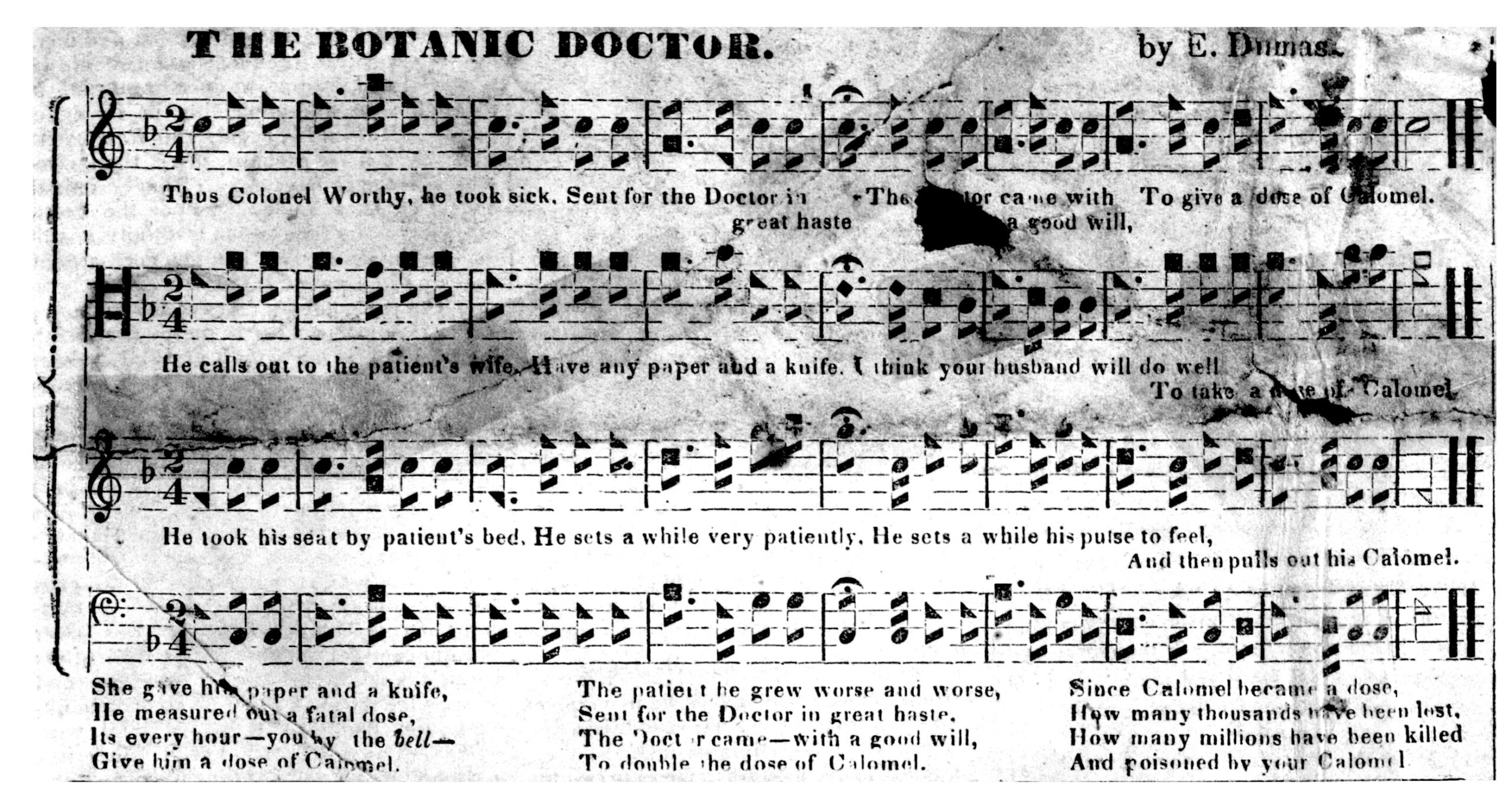 In the mid-nineteenth century, comic songs circulated alongside serious hymns, often poking fun at doctors, preachers, and other figures of daily life. One such piece is “The Botanic Doctor” by Edmund Dumas (1810–1882), printed in The Organ, a short-lived periodical edited by B. F. White, compiler of The Sacred Harp. The song lampoons the practice of dosing patients with calomel, a mercury-based medicine once prescribed for nearly every ailment. Its verses describe a sick Colonel Worthy, whose doctor confidently prescribes calomel in ever larger doses, to disastrous effect. With humor and satire, the text reflects both a challenge against medical authorities of the time and growing awareness of calomel’s specific dangers.